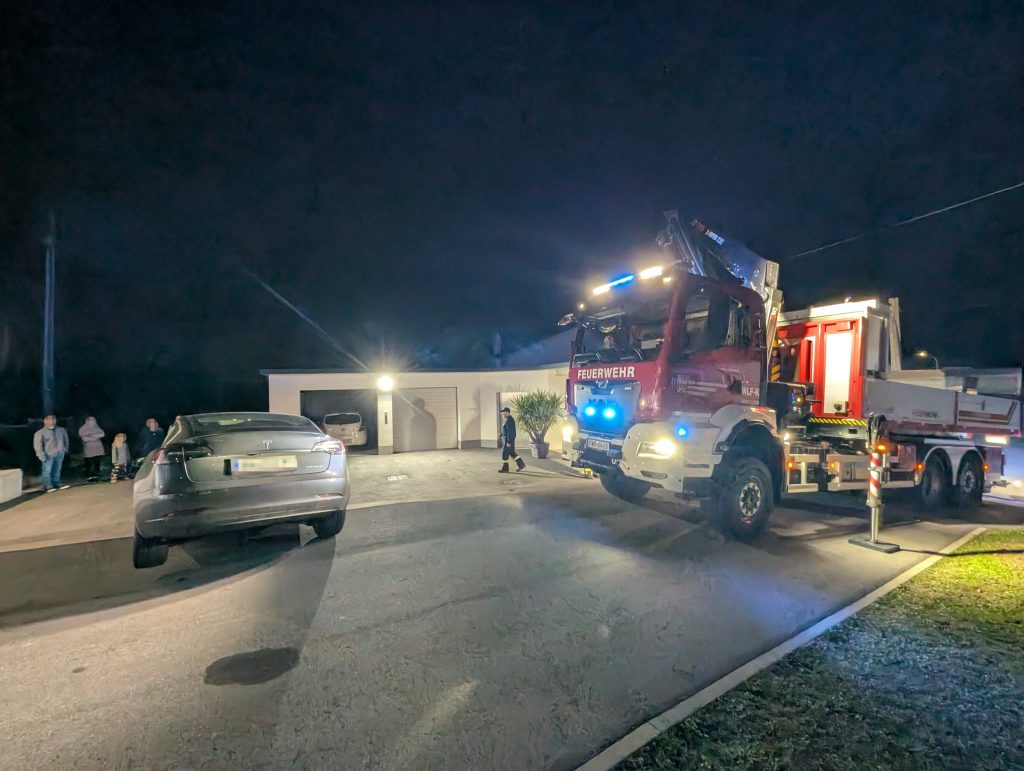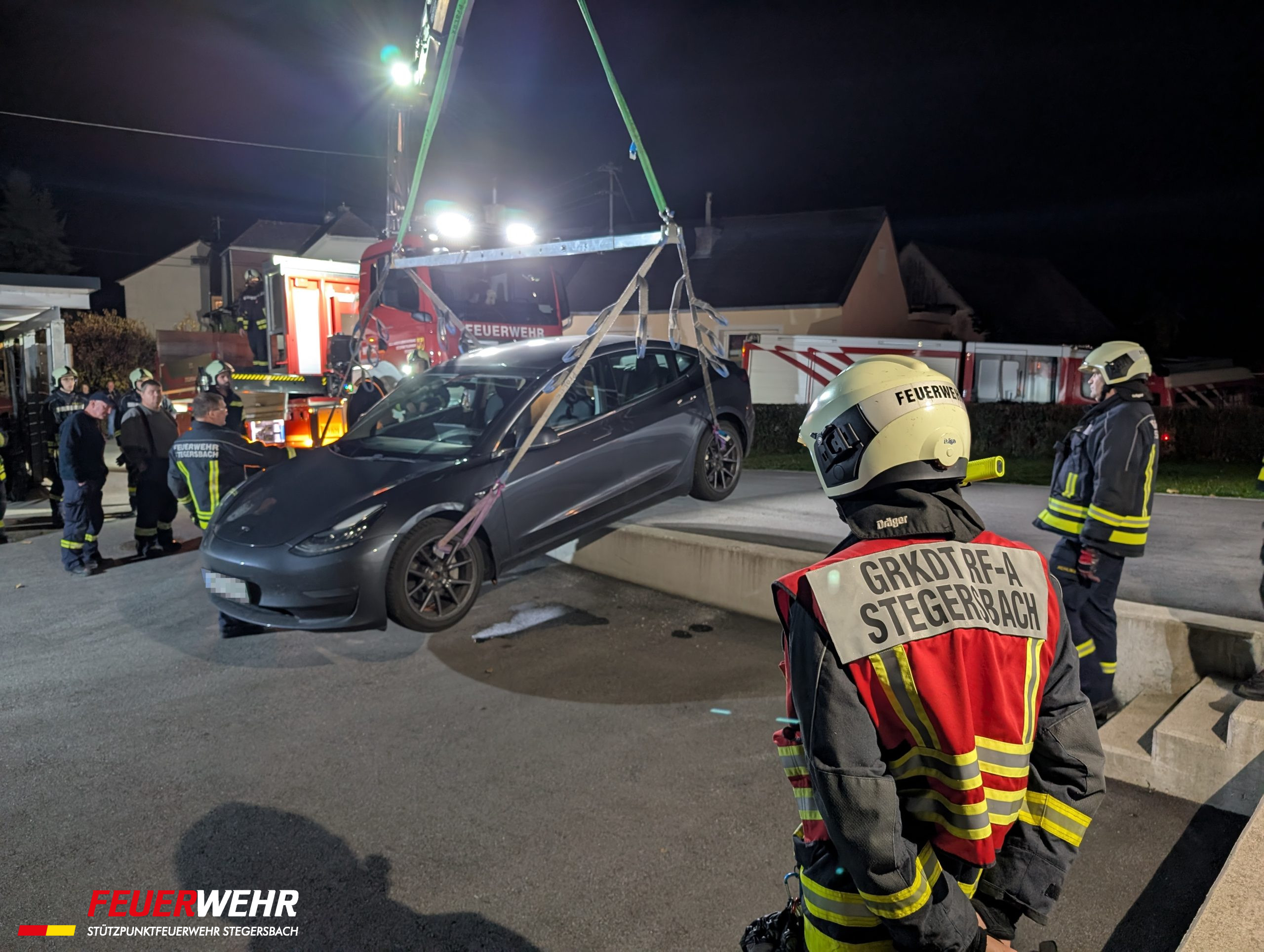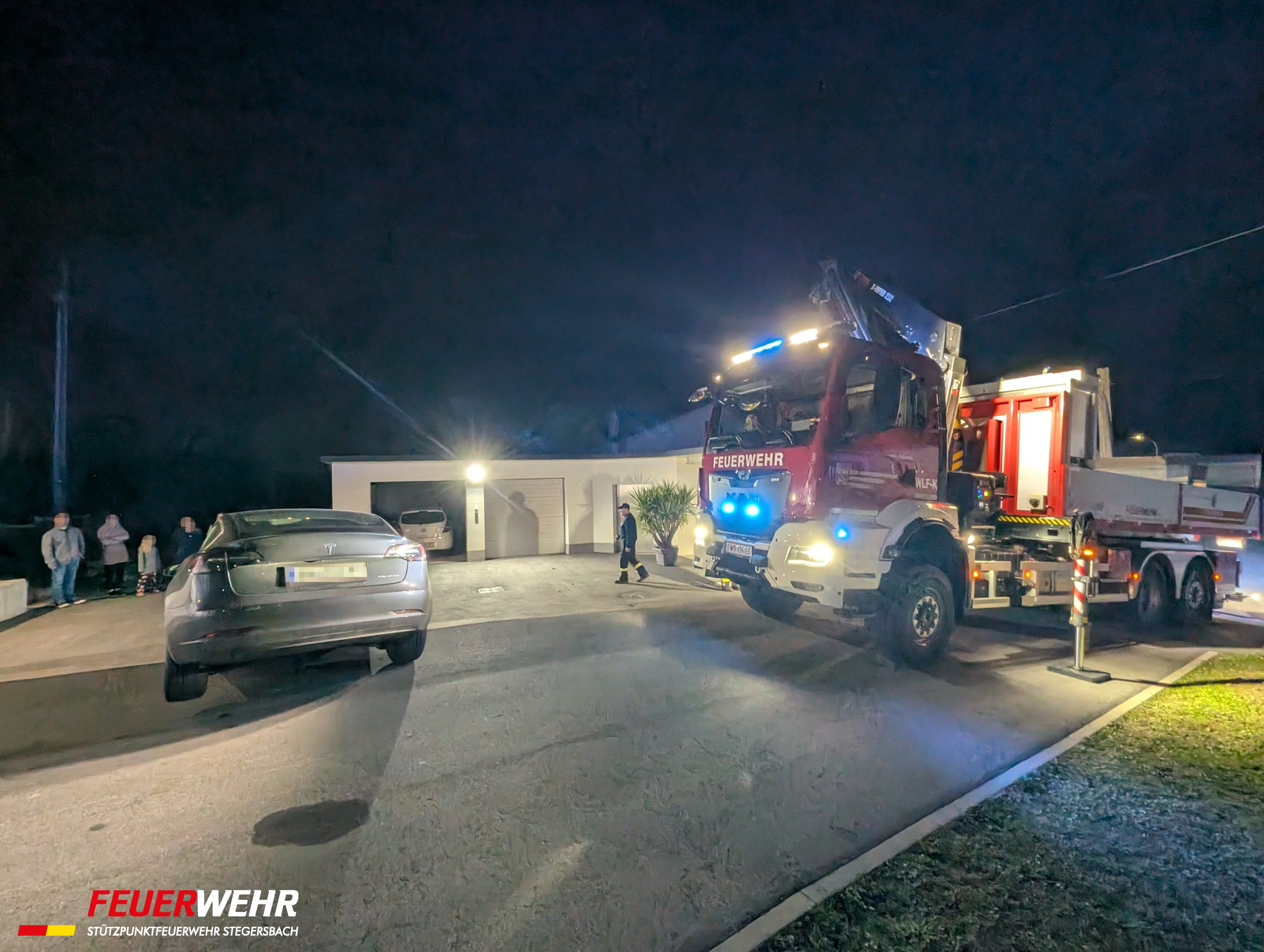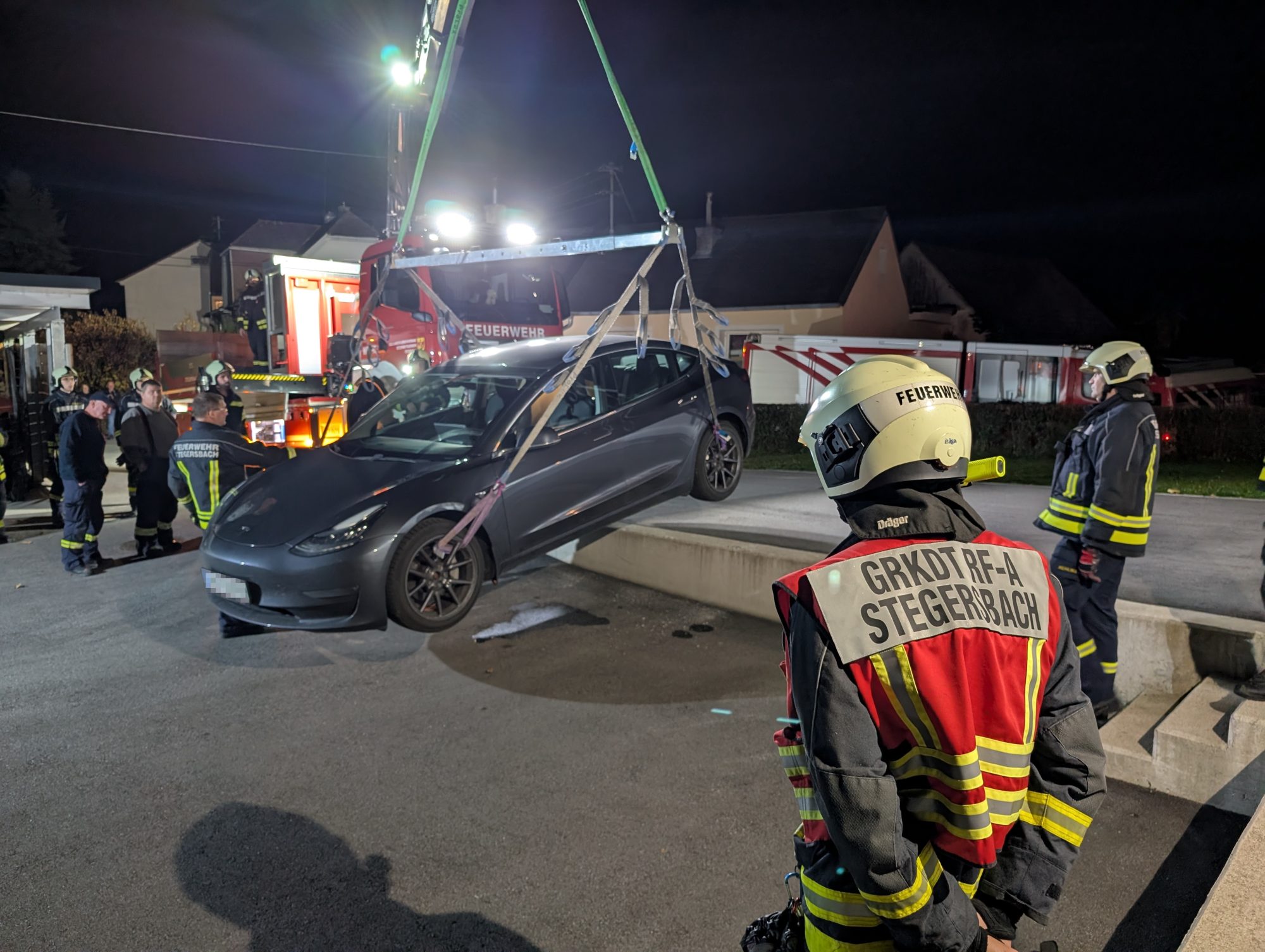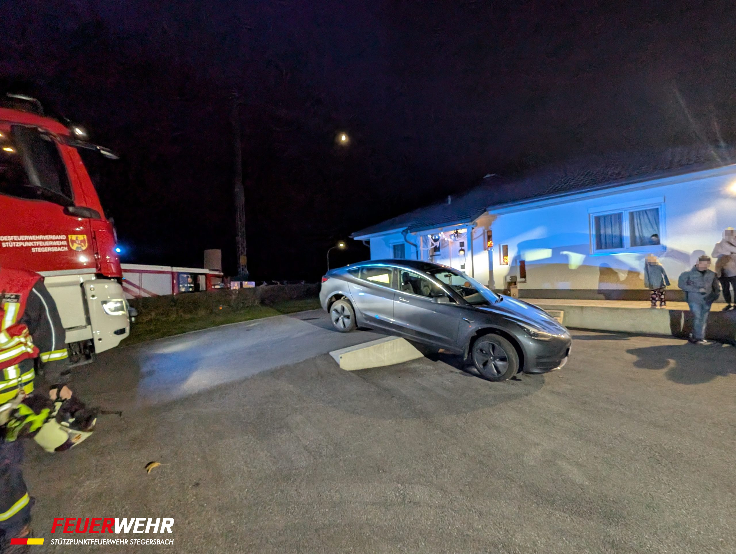 Bei einem missglückten Wendemanöver blieb ein Elektrofahrzeug auf einer Stützmauer hängen. Mit gekonnten Handgriffen und der Unterstützung des Ladekrans des WLF konnte der PKW rasch aus seiner Lage befreit werden. Das Fahrzeug konnte die Fahrt unbeschädigt fortsetzen, verletzt wurde niemand.