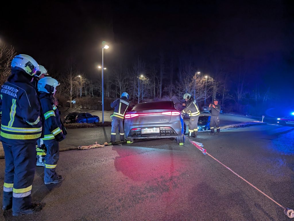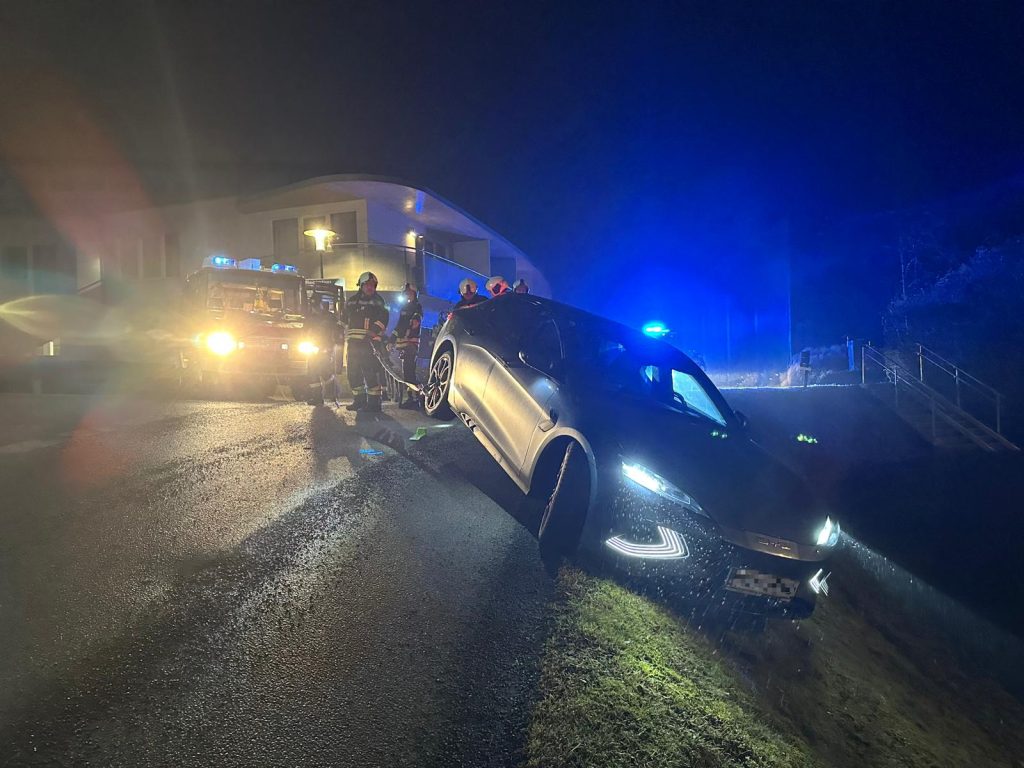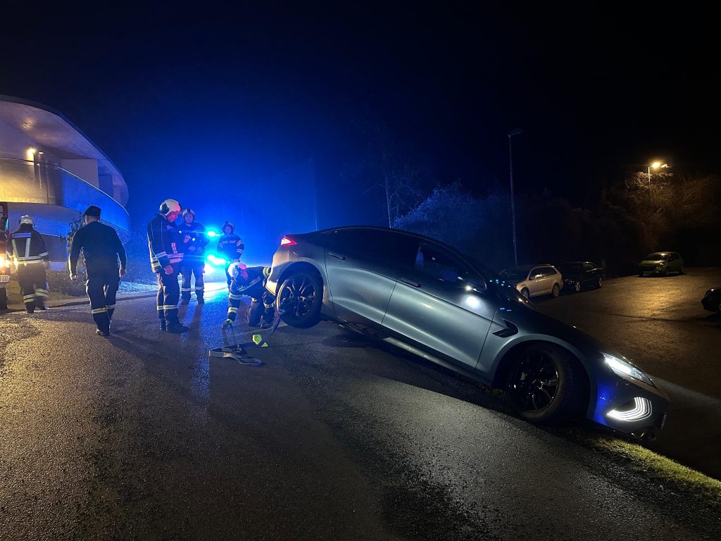 Aus ungeklärter Ursache kam ein Elektrofahrzeug im Bereich Golfstraße / Am Hochfeld von der Straße ab und blieb auf einer Böschung hängen. Mittels Seilwinde und Gleitkeilen wurde der PKW mit routinierten Handgriffen wieder auf die Fahrbahn versetzt. Verletzt wurde niemand.