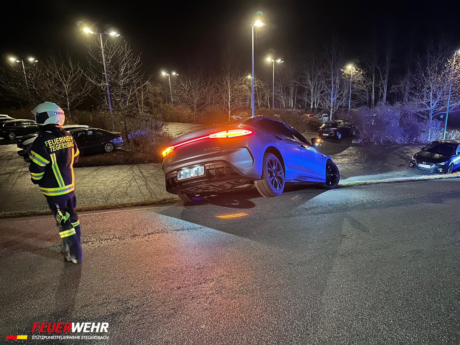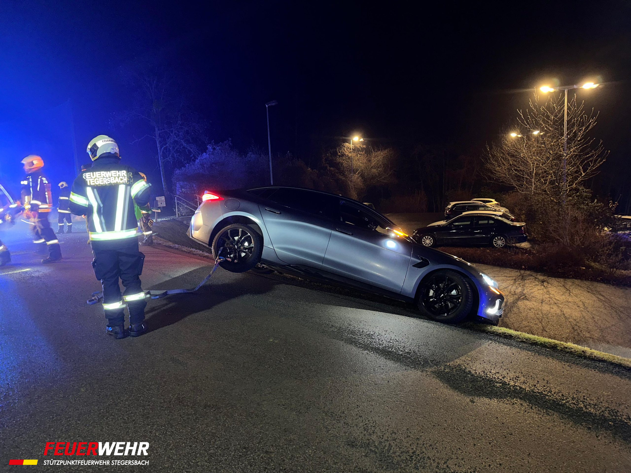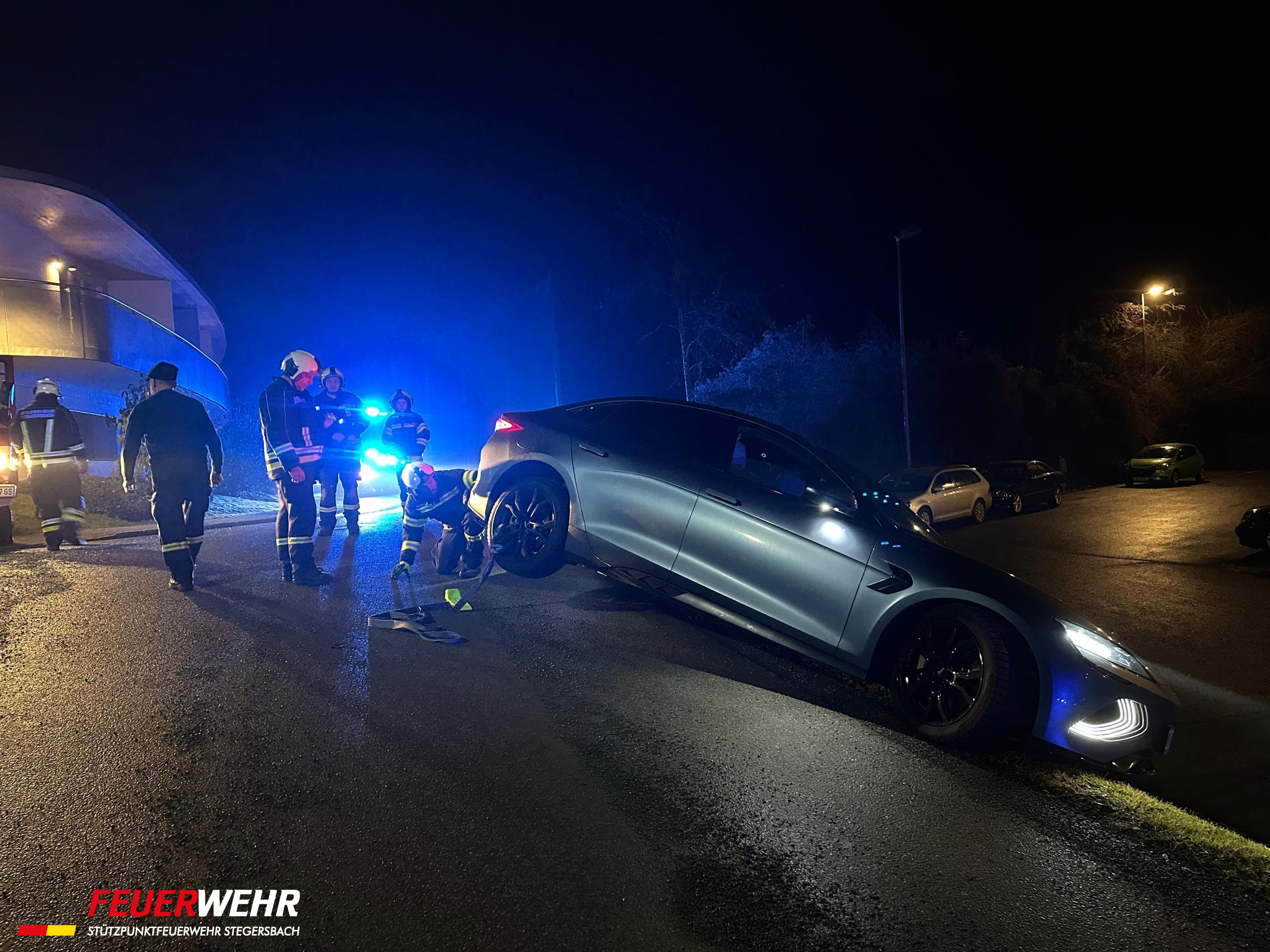 Aus ungeklärter Ursache kam ein Elektrofahrzeug im Bereich Golfstraße / Am Hochfeld von der Straße ab und blieb auf einer Böschung hängen. Mittels Seilwinde und Gleitkeilen wurde der PKW mit routinierten Handgriffen wieder auf die Fahrbahn versetzt. Verletzt wurde niemand.