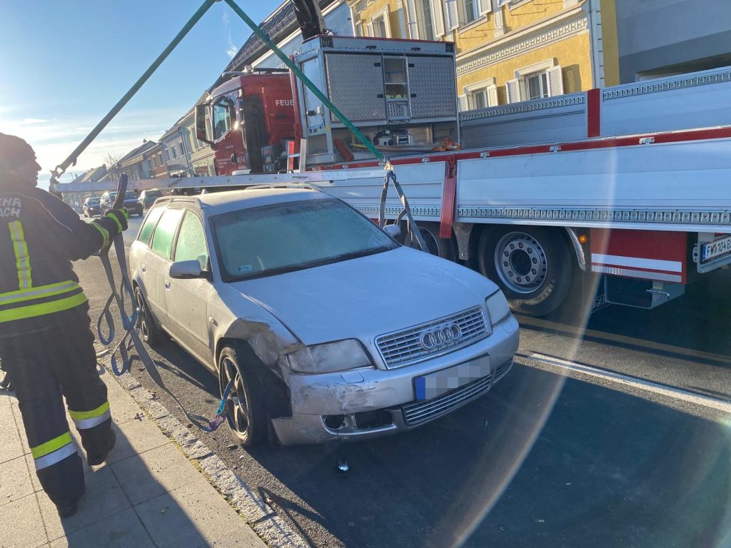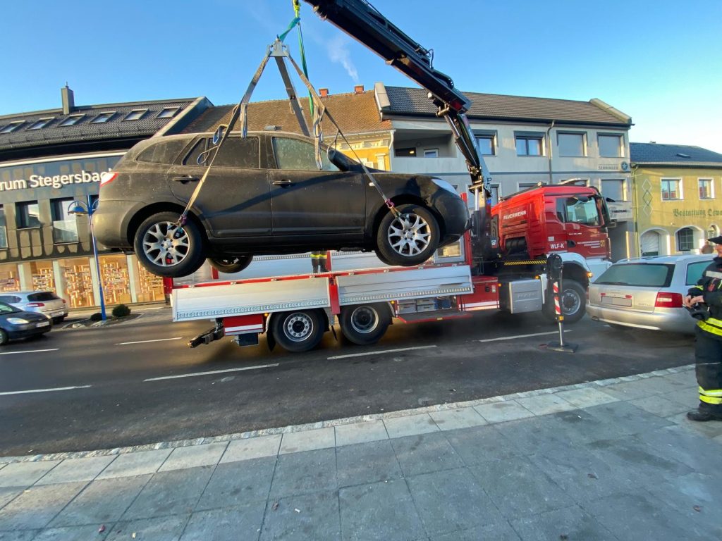 Nach einem abendlichen Verkehrsunfall wurden wir heute Früh von der Polizei zur Verbringung der beiden Unfallfahrzeuge am Hauptplatz in Stegersbach gerufen. Die beiden Fahruntüchtigen PKW wurden mittels Kran verladen und abseits der vielbefahrenen Bundesstraße gesichert abgestellt.