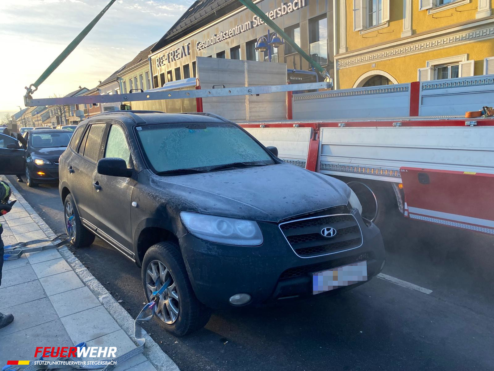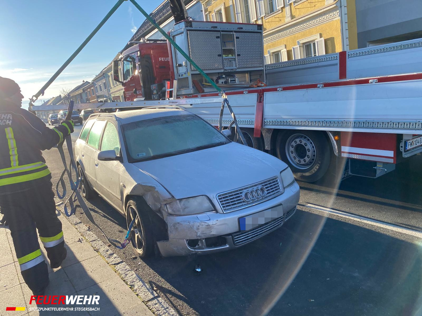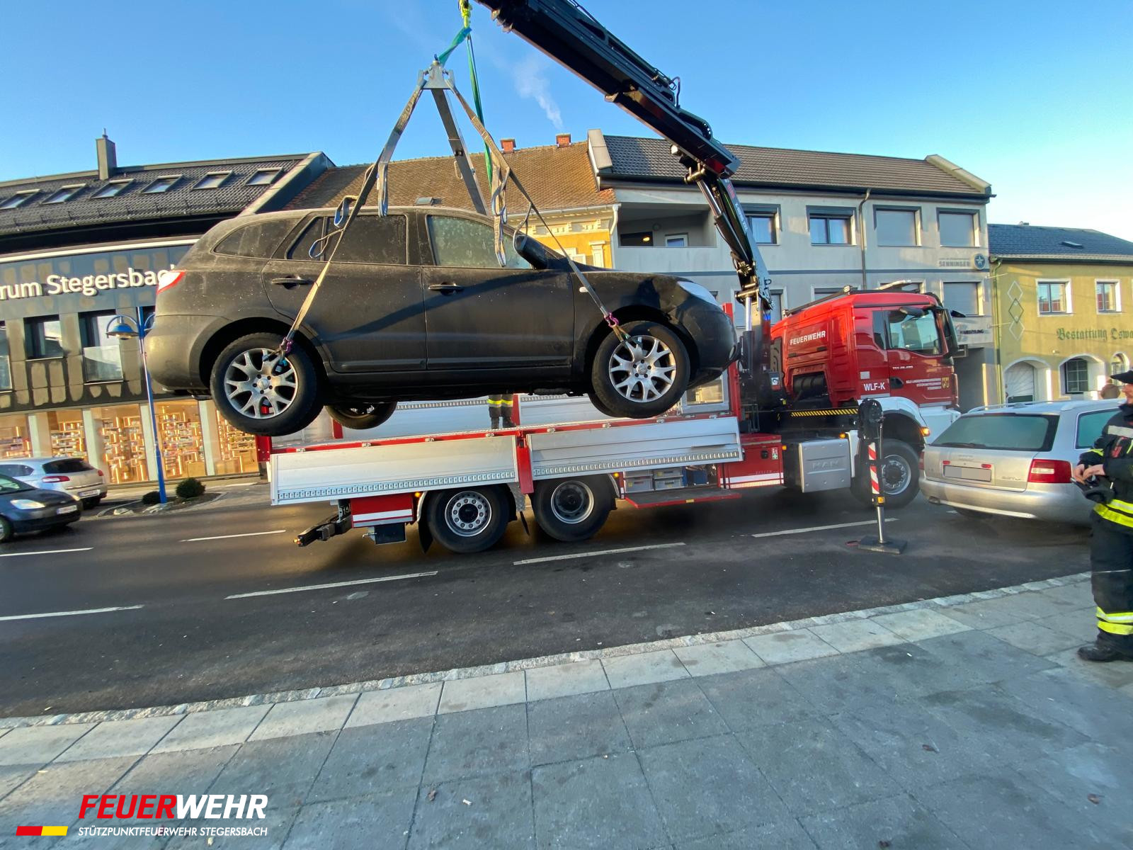 Nach einem abendlichen Verkehrsunfall wurden wir heute Früh von der Polizei zur Verbringung der beiden Unfallfahrzeuge am Hauptplatz in Stegersbach gerufen. Die beiden Fahruntüchtigen PKW wurden mittels Kran verladen und abseits der vielbefahrenen Bundesstraße gesichert abgestellt.