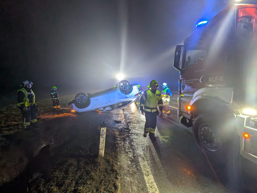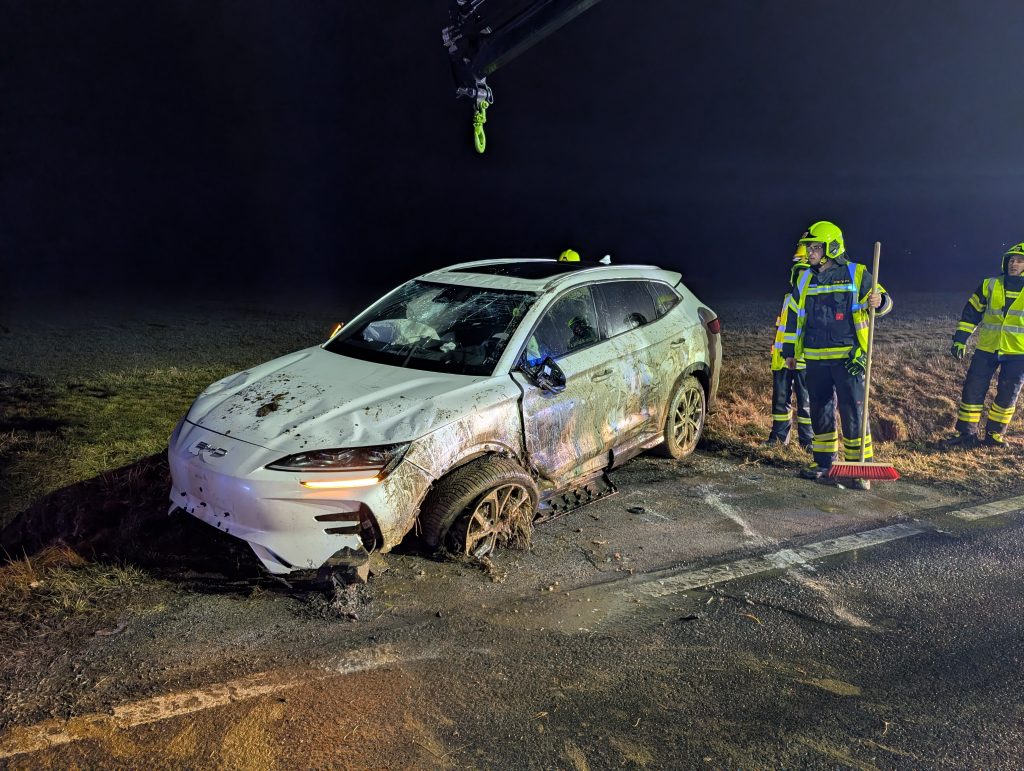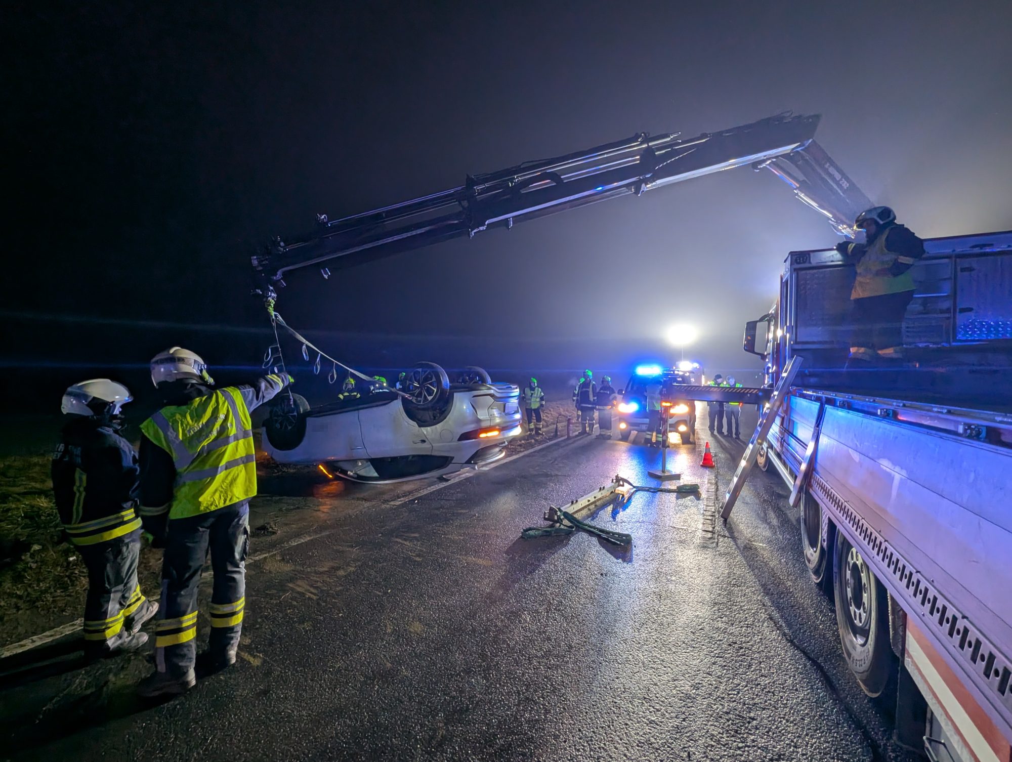 Zum zweiten Einsatz binnen weniger Stunden wurde die Feuerwehr Stegersbach von der FF Rauchwart gerufen. Auf der Bundesstraße hat sich aus ungeklärter Ursache ein PKW überschlagen und war am Dach liegen geblieben. Wir bargen nach Freigabe der Unfallstelle das Elektrofahrzeug mittels Kran des WLF und stellten es gesichert ab. Der Fahrer wurde unbestimmten Grades verletzt und vom Rettungsdienst in ein Spital gebracht.
