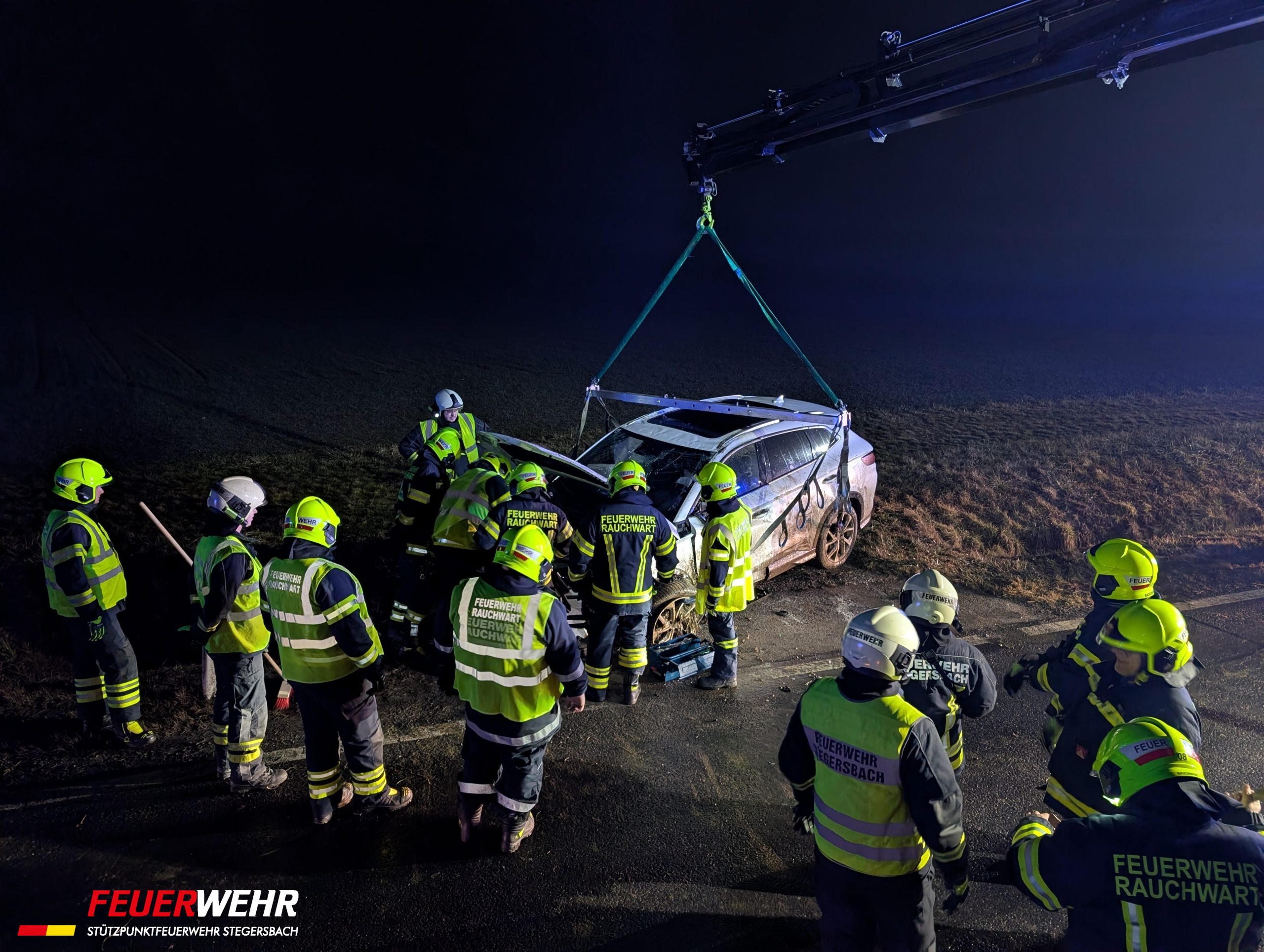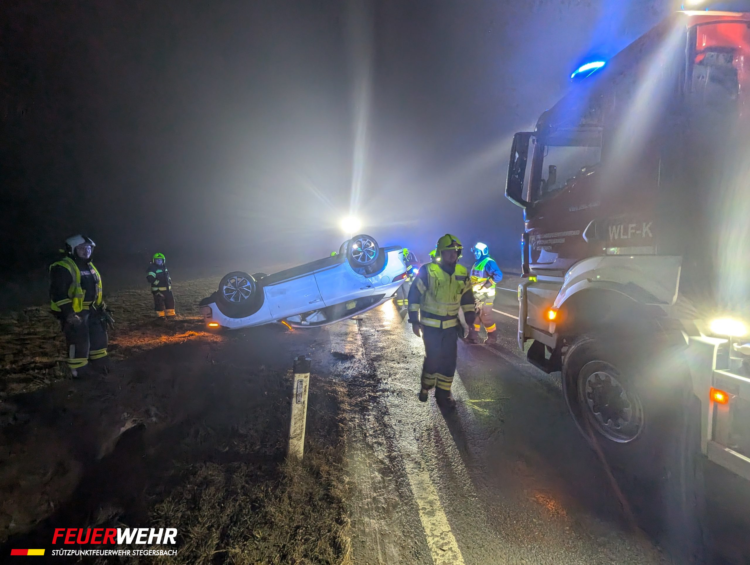 Zum zweiten Einsatz binnen weniger Stunden wurde die Feuerwehr Stegersbach von der FF Rauchwart gerufen. Auf der Bundesstraße hat sich aus ungeklärter Ursache ein PKW überschlagen und war am Dach liegen geblieben. Wir bargen nach Freigabe der Unfallstelle das Elektrofahrzeug mittels Kran des WLF und stellten es gesichert ab. Der Fahrer wurde unbestimmten Grades verletzt und vom Rettungsdienst in ein Spital gebracht.