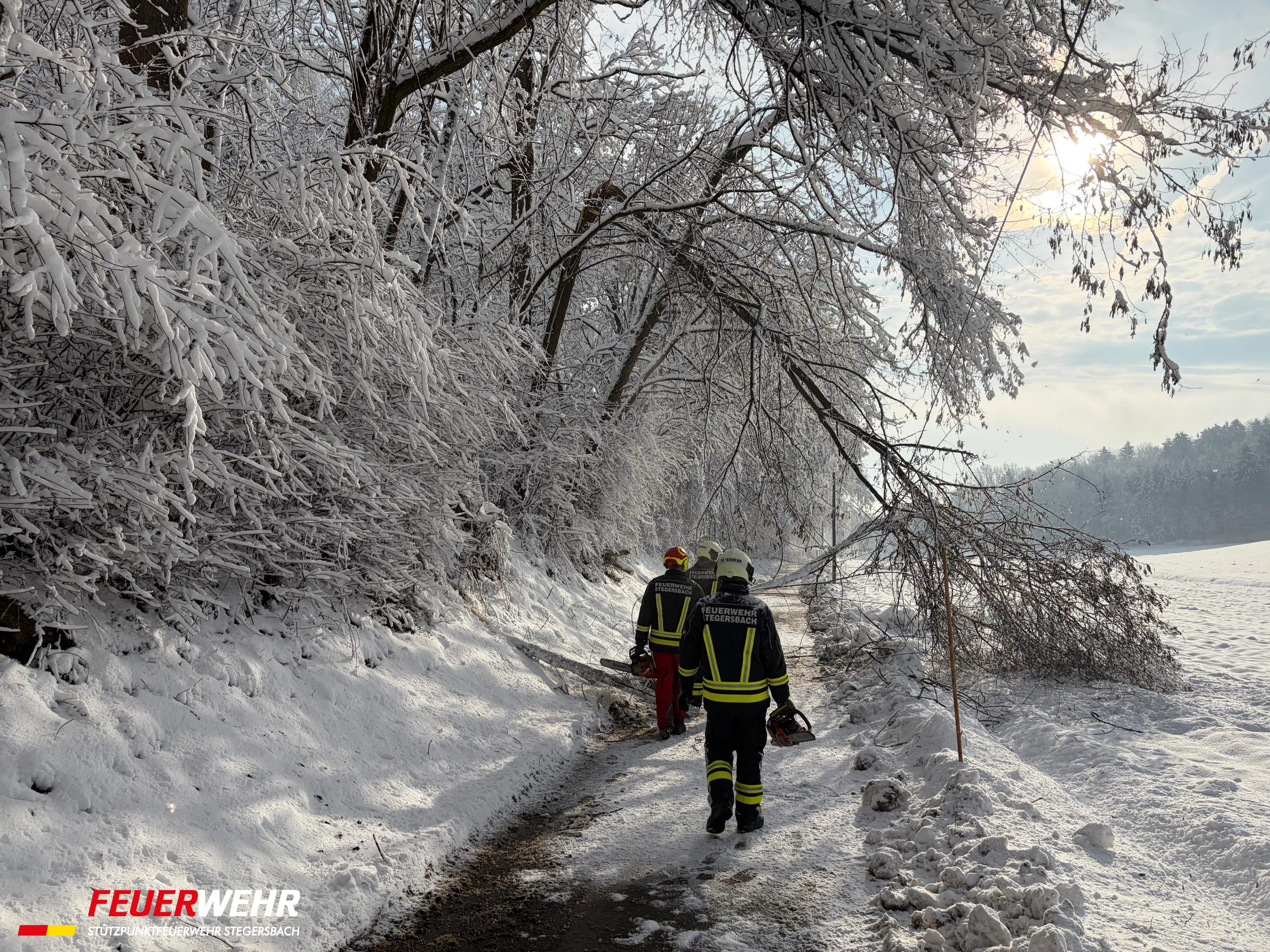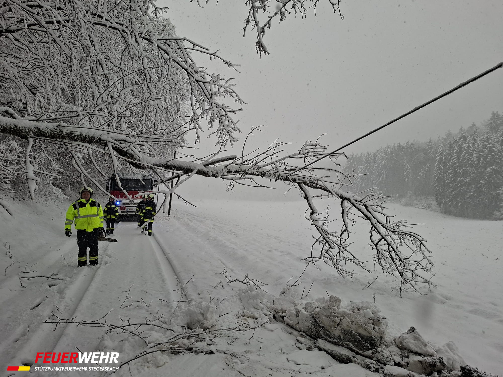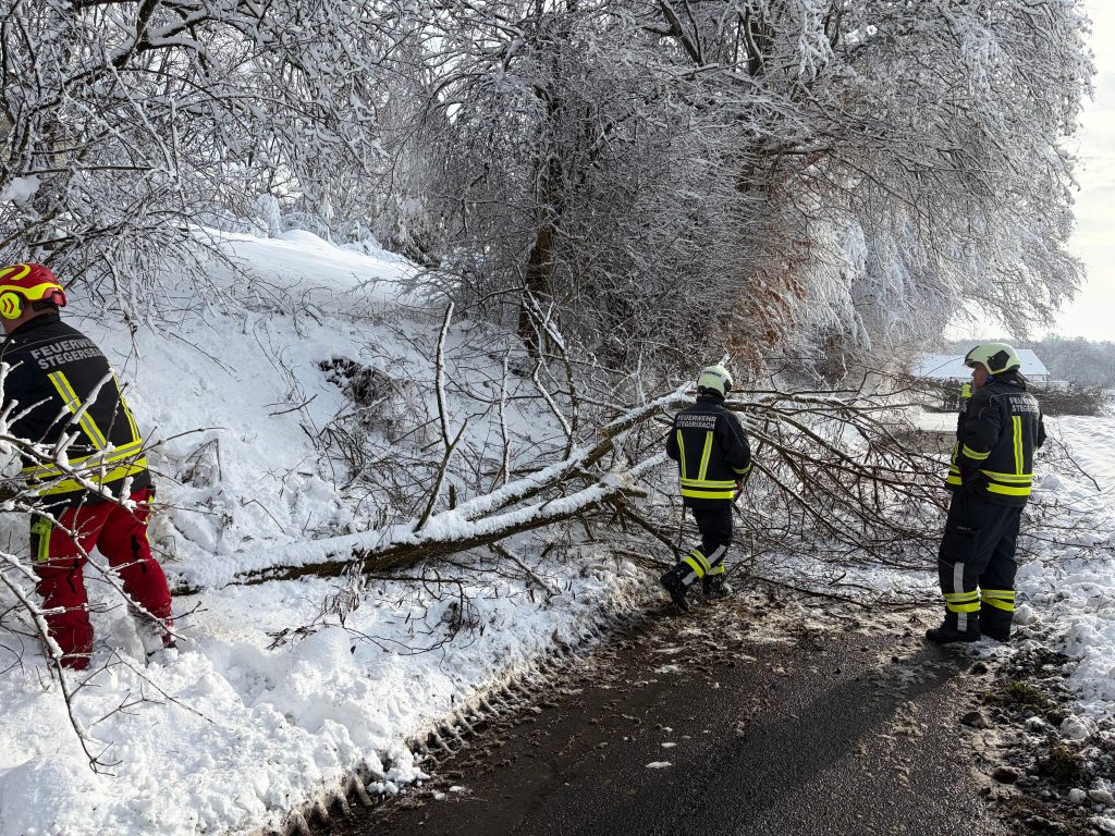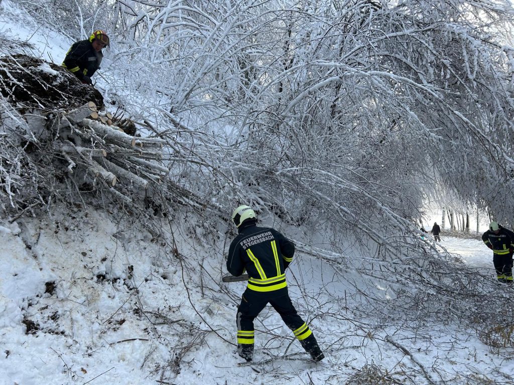Durch die enorme Schneelast kam es vermehrt zu umstürzenden Bäumen. In einigen Straßenzügen im Ortsgebiet von Stegersbach mussten aus Sicherheitsgründen Straßensperren eingerichtet werden, da die Gefahr weiterer umstürzender Bäume für unsere Einsatzkräfte zu hoch war.